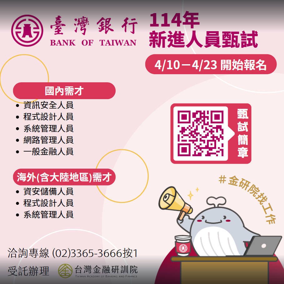 【徵才】「臺灣銀行114年新進人員甄試」資訊