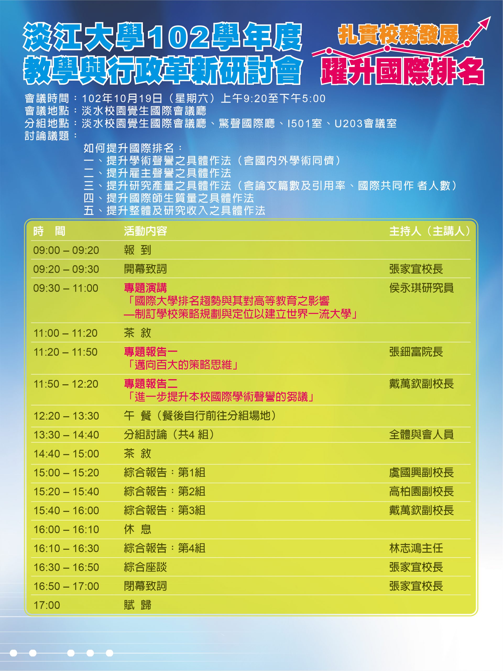 扎實校務發展,躍升國際排名 專題演講 國際大學排名趨勢與其對高等教育之影響—制訂學校策略規劃與定位以建立世界一流大學 專題報告 邁向百大的策略思維 專題報告 進一步提昇本校國際聲譽的芻見
