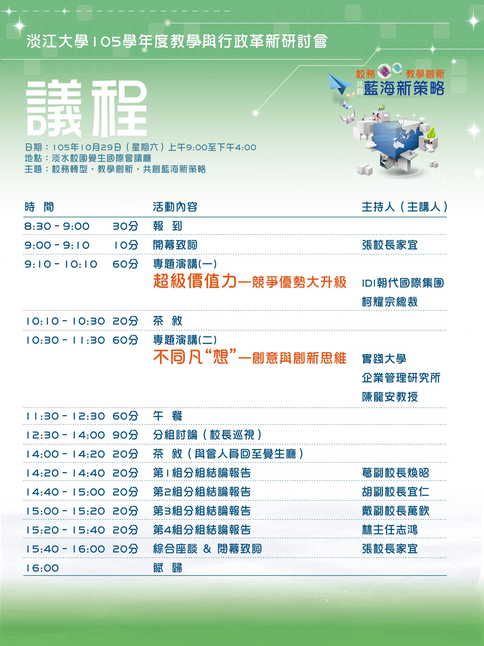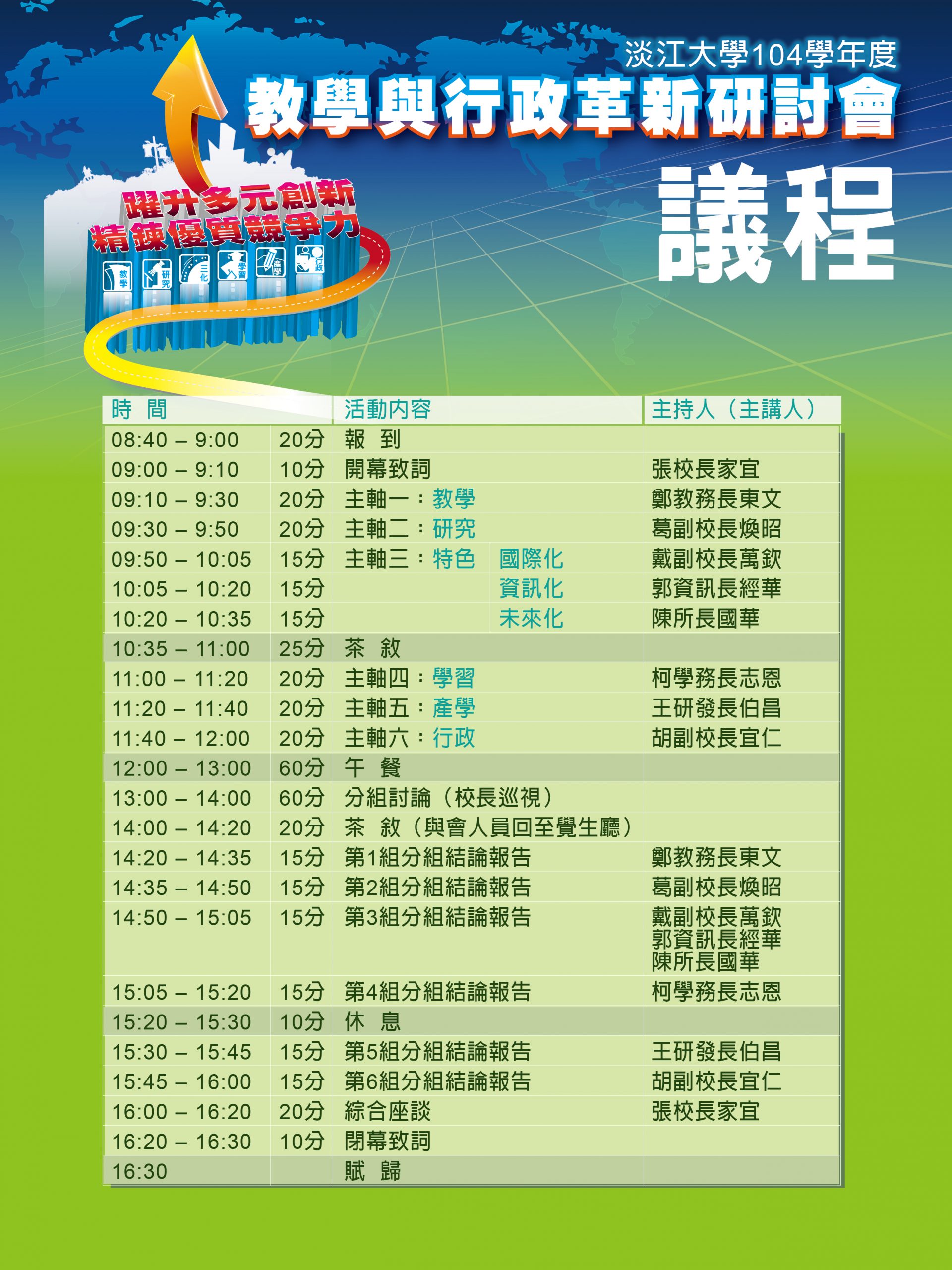 傳承、創新、新淡江-尋找淡江DNA,迎接60週年校慶 專題報告(一)數位原生:教學革新的啟示 專題報告(二)精緻深化淡大大三留學政策之成效:貫徹全面品質管理之精神 專題報告(三)60週年校慶回顧與展望