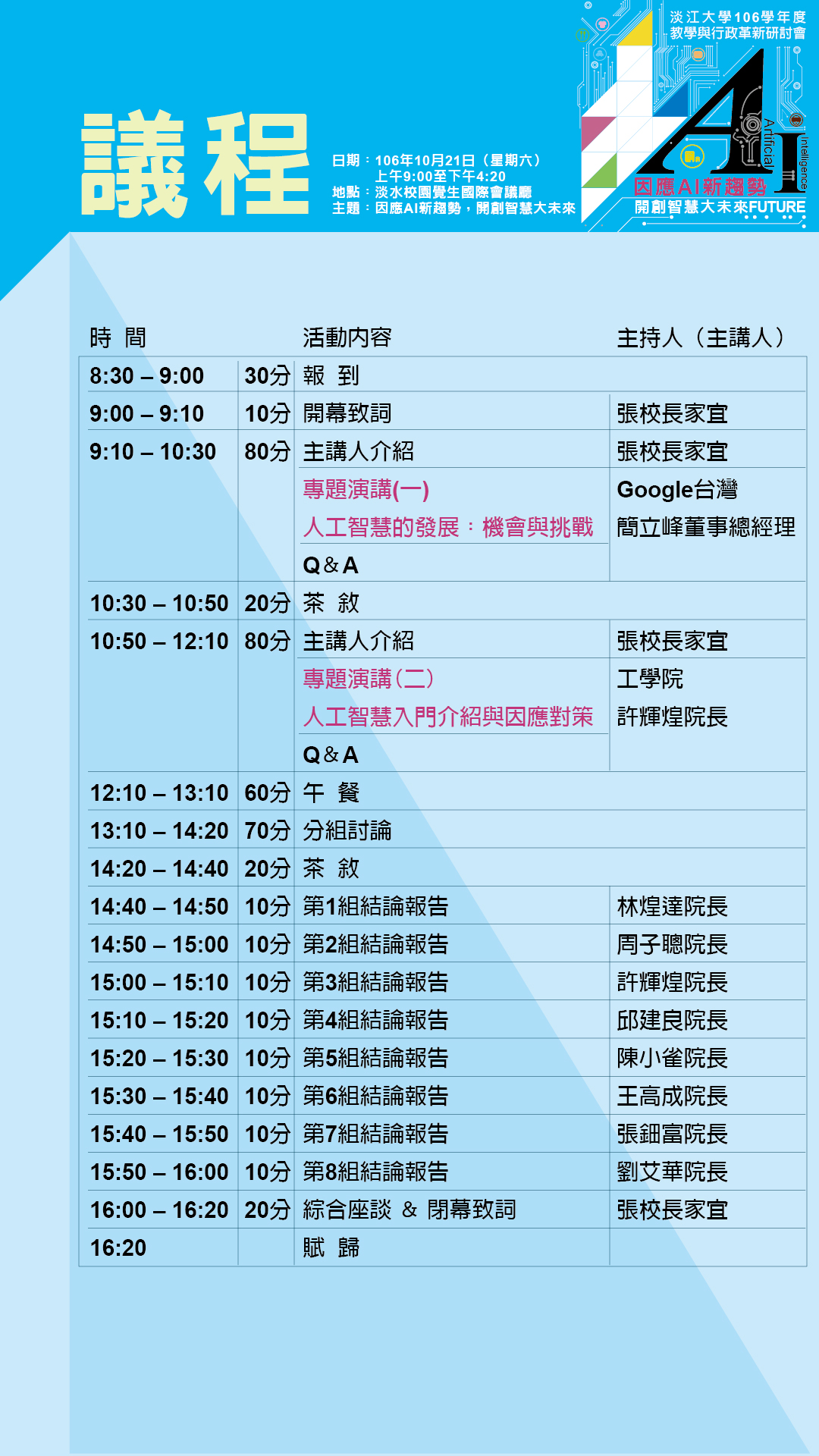 因應AI新趨勢,開創智慧大未來 專題演講 人工智慧的挑戰:機會與挑戰 專題演講 人工智慧入門介紹與因應對策