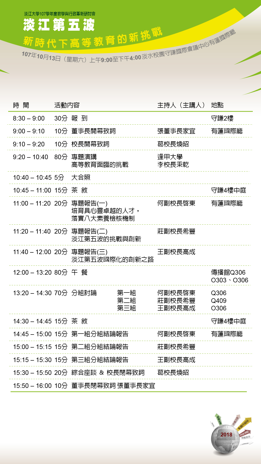 淡江第五波–新時代下高等教育的新挑戰 專題演講 高等教育面臨的挑戰 專題報告 培育具心靈卓越的人才,落實八大素養檢核機制 專題報告 淡江第五波的挑戰與創新 專題報告 淡江第五波國際化的創新之路