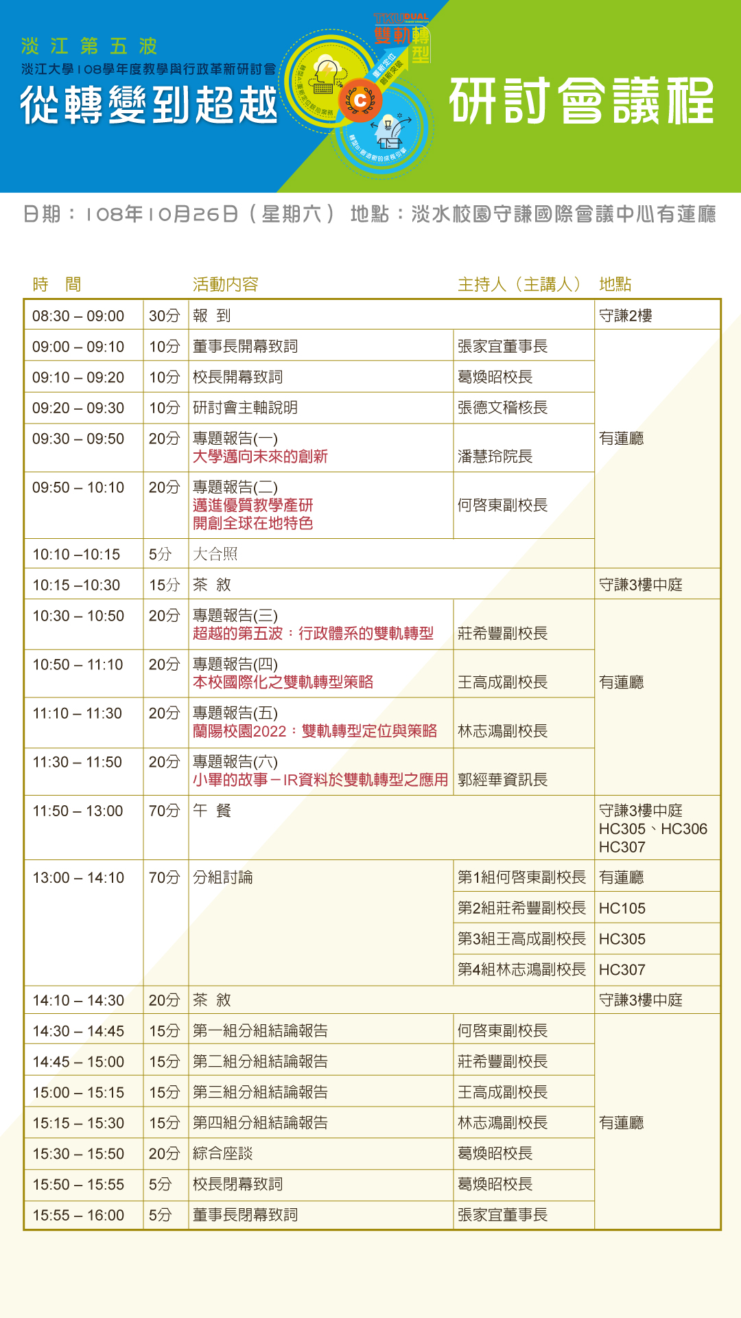 淡江第五波:從轉變到超越 副標題:重新定位與創新突破之雙軌轉型 專題報告(一)大學邁向未來的創新 專題報告(二)邁進優質教學產研開創全球在地特色 專題報告(三)超越的第五波:行政體系的雙軌轉型 專題報告(四)本校國際化之雙軌轉型策略 專題報告(五)蘭陽校園2022:雙軌轉型定位與策略 專題報告(六)小畢的故事-IR資料於雙軌轉型之應用