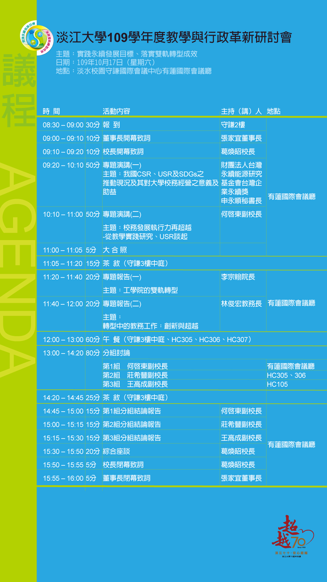 實踐永續發展目標 落實雙軌轉型成效 專題演講(一)我國CSR、USR及SDGs之推動現況及其對大學校務經營之意義及助益 專題演講(二)校務發展執行力再超越-從教學實踐研究、USR談起 專題報告(一)工學院的雙軌轉型 專題報告(二)轉型中的教務工作:創新與超越