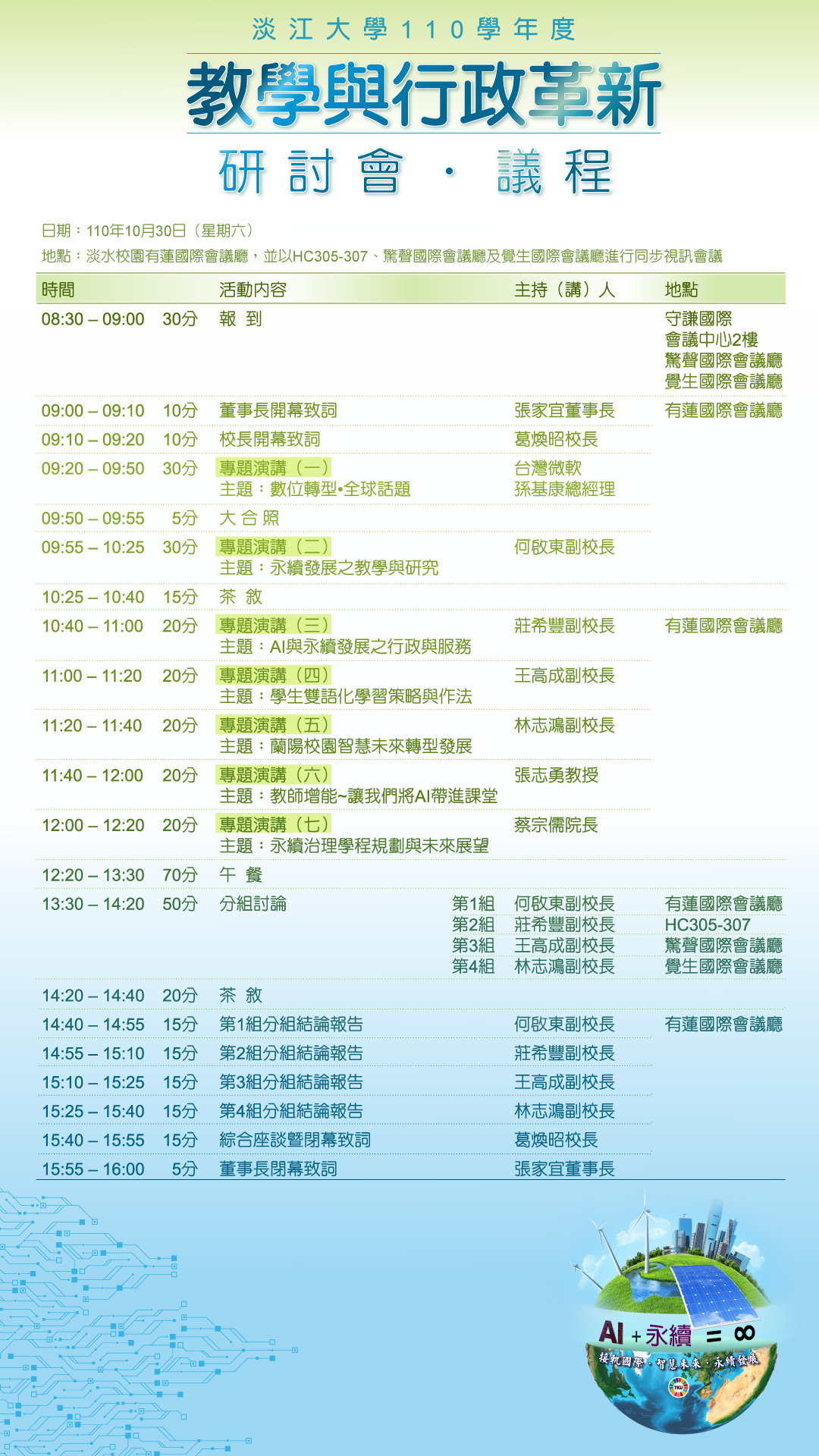 智慧引領淨零未來之旅 專題演講(一)大學之大是於共善—逢甲大學邁向永續校園之旅-逢甲大學 王葳校長 專題演講(二)淨零轉型之人才培育、科技研發與生活實驗-許輝煌副校長 專題演講(三)淨零創新與智慧行政:當AI進入校園 林俊宏副校長 專題演講(四)步向淨零未來:世界公民行動-陳小雀副校長 專題演講(五)可持續性校園:淡江大學實現淨零排放的征程-李奇旺組長