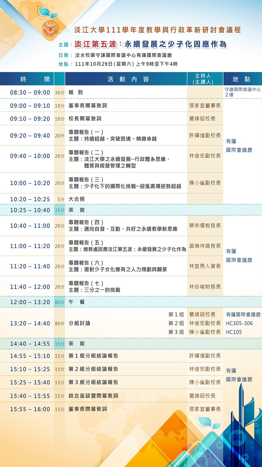 淡江第五波:永續發展之少子化因應作為 專題報告(一)持續超越。突破困境。精緻卓越-許輝煌副校長 專題報告(二)淡江大學之永續發展─行政體系思維、體質與經營管理之轉型-林俊宏副校長 專題報告(三)少子化下的國際化挑戰─迎風鷹揚逆勢超越-陳小雀副校長 專題報告(四)邁向自發、互動、共好之永續教學新思維-蔡宗儒教務長 專題報告(五)總務處因應淡江第五波:永續發展之少子化作為-蕭瑞祥總務長 專題報告(六)面對少子女化應有之人力規劃與願景-林宜男人資長 專題報告(七)三分之一的挑戰-林谷峻財務長