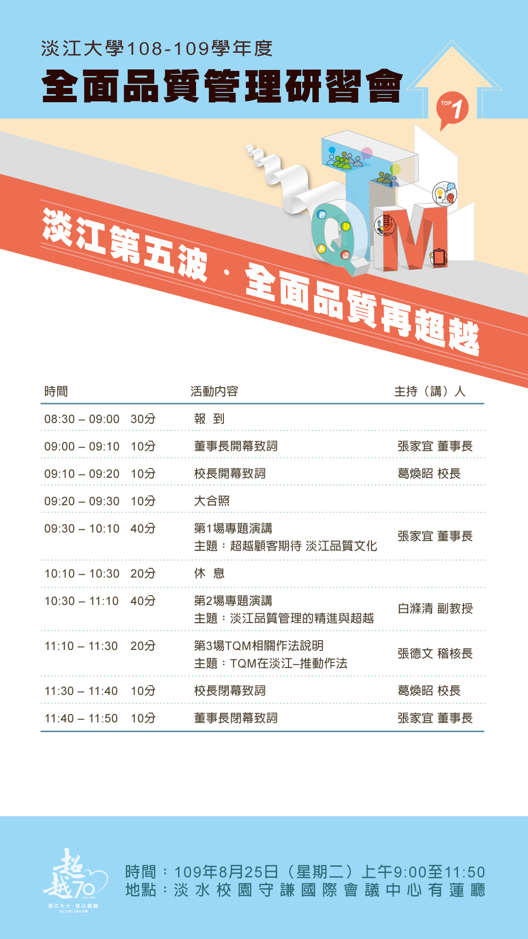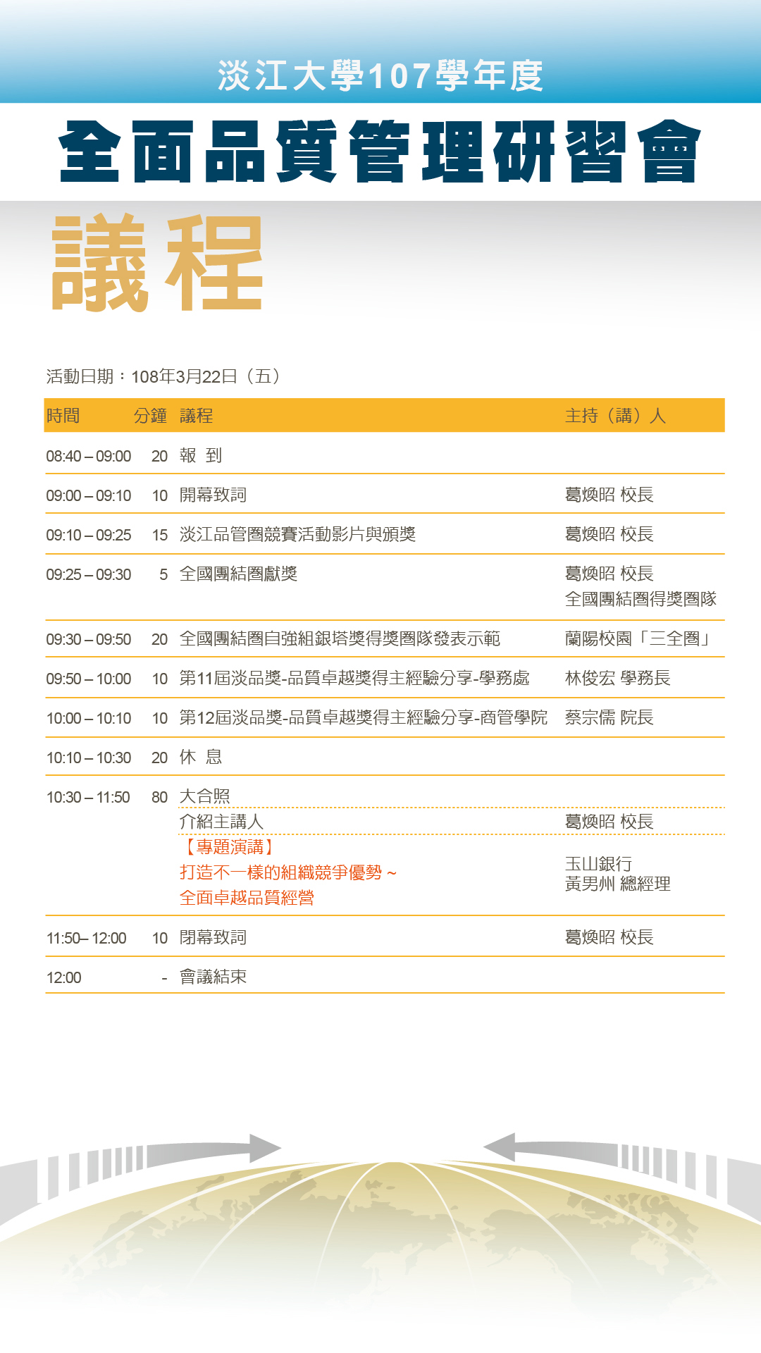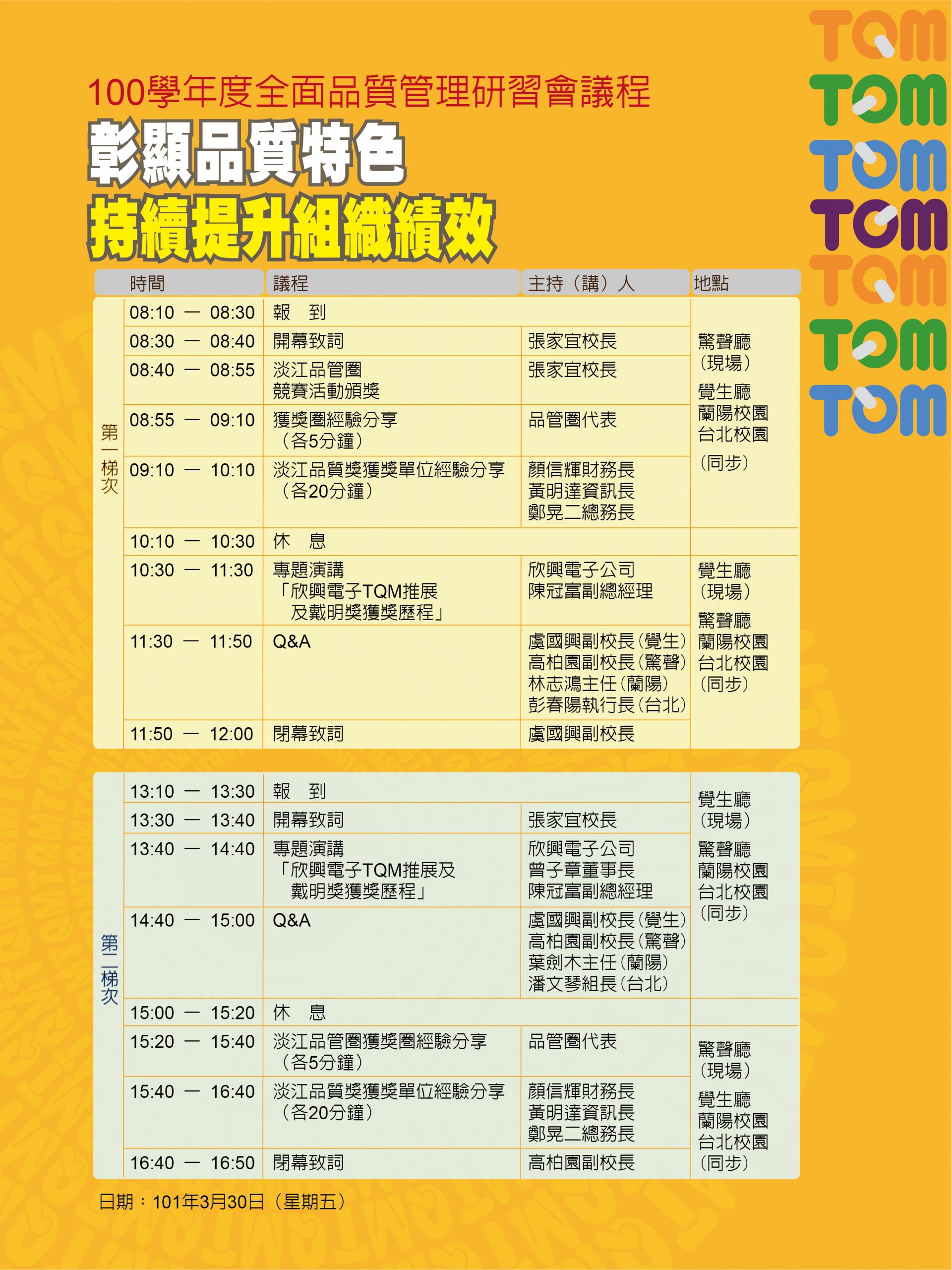 為循序建立行政體系與全體成員對TQM之認知,每年定期舉辦「全面品質管理研習會」,邀請國內外品質管理專家及學者進行專題演講及座談,研討TQM相關主題及辦理教育訓練課程,藉此廣為宣導TQM之精神內涵與理念,使同仁了解組織使命及願景,並以實施TQM做為工作推動之方針。