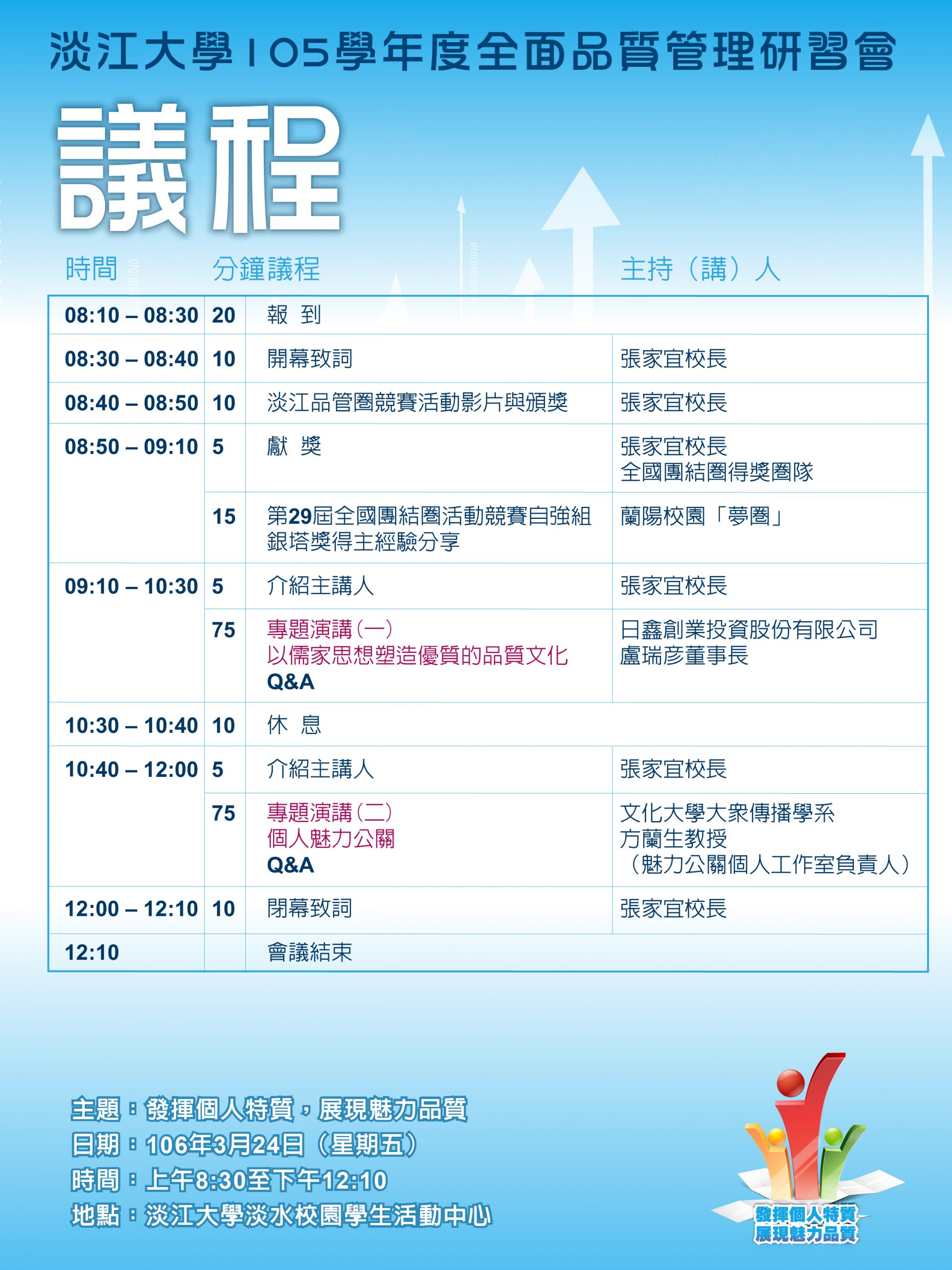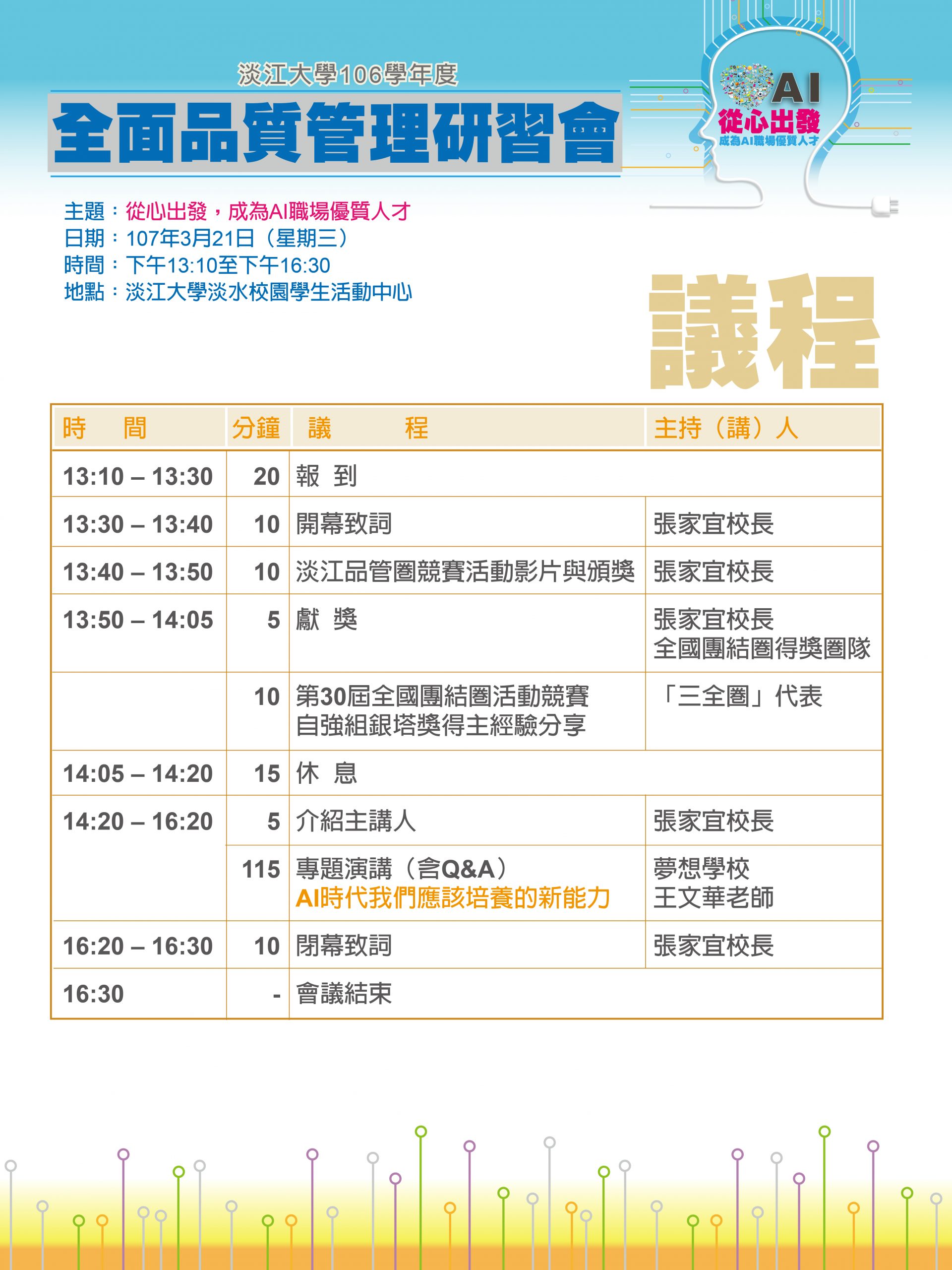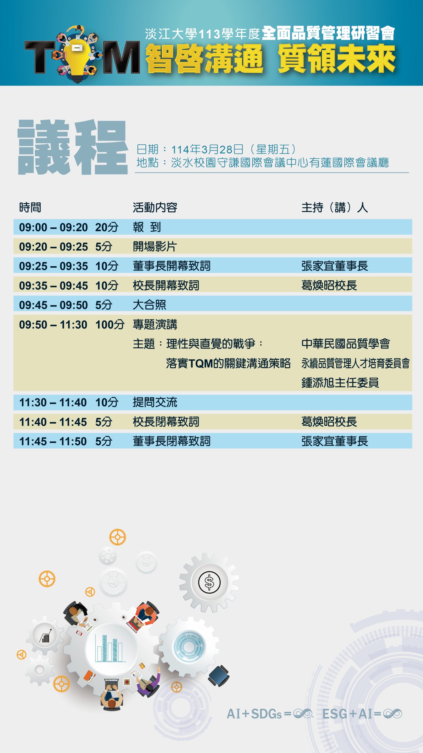 為循序建立行政體系與全體成員對TQM之認知,每年定期舉辦「全面品質管理研習會」,邀請國內外品質管理專家及學者進行專題演講及座談,研討TQM相關主題及辦理教育訓練課程,藉此廣為宣導TQM之精神內涵與理念,使同仁了解組織使命及願景,並以實施TQM做為工作推動之方針。