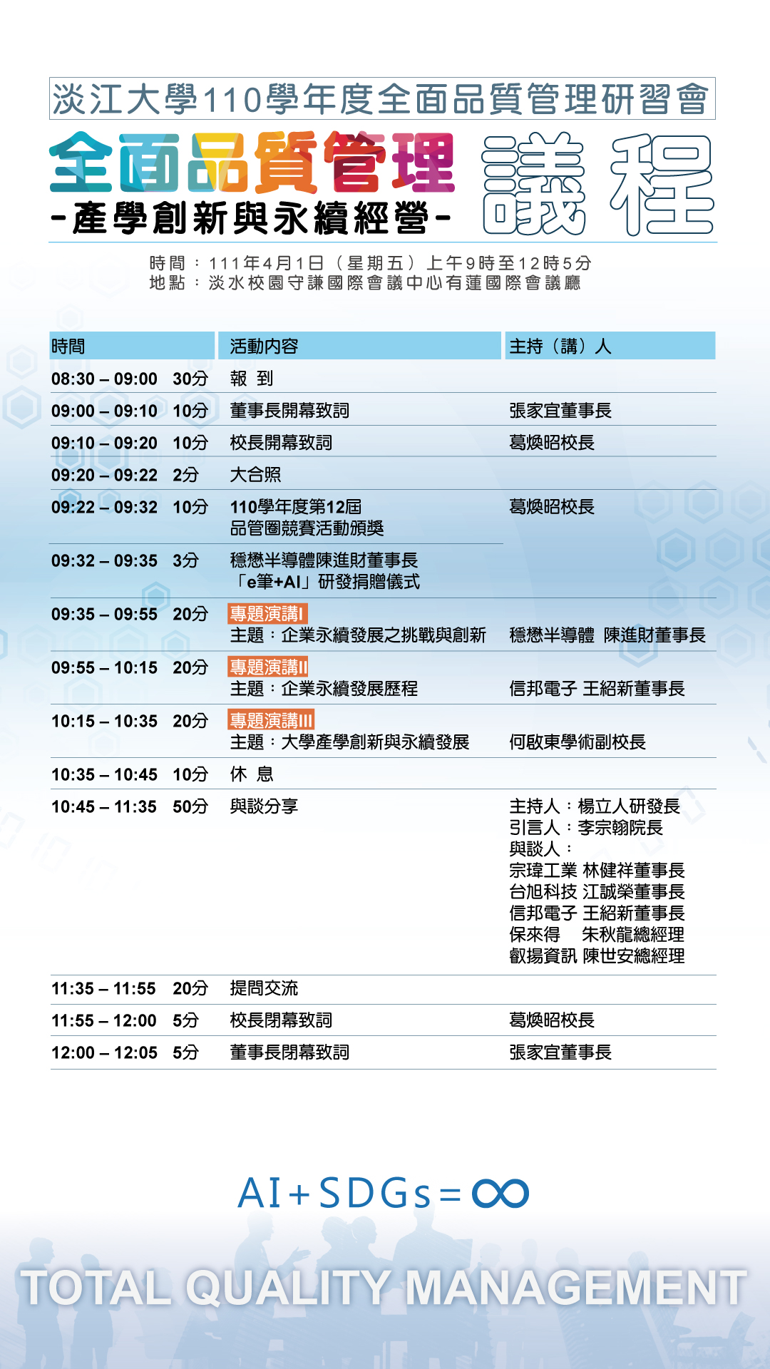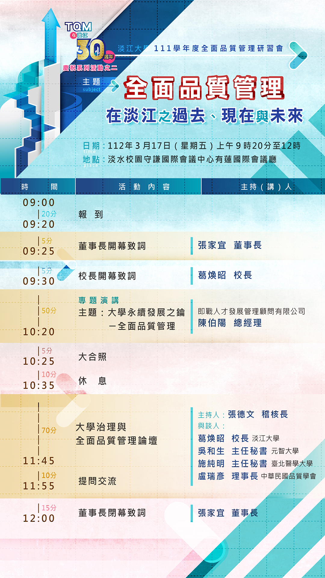 自1992年起,張創辦人建邦將全面品質管理(TQM)之理念引進淡江治理體系,有效帶動淡江管理模式,提升教學、研究、服務與輔導之品質,其推行TQM之歷程,可分為下述四個階段:導入期(1993 ~1998 年)、扎根期(1999~2006 年)、精進期(2007~2014 年)、超越期(2015 年之後)。