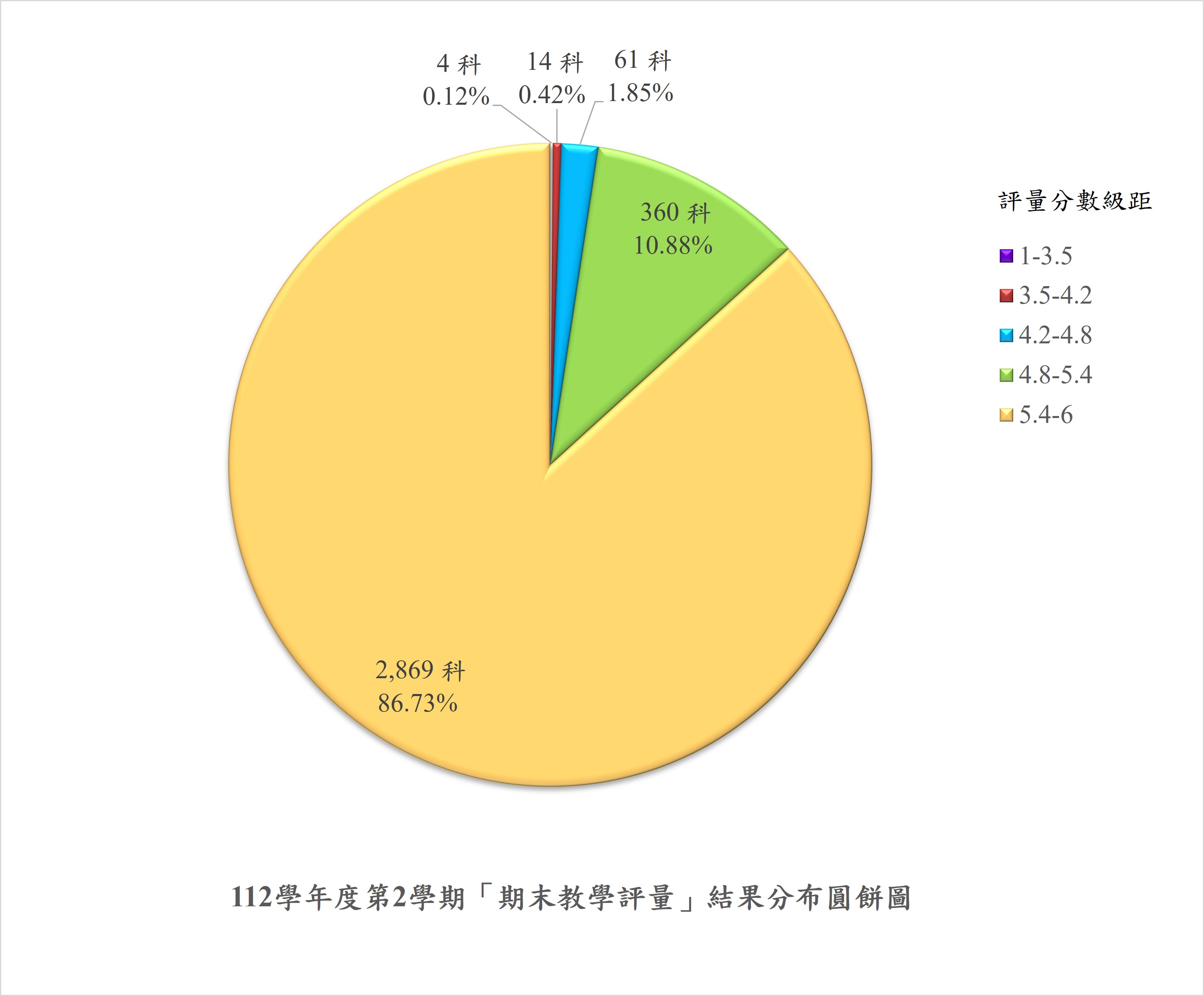 分析教學評量所有受評科目之評量結果,在不考慮回收率高低之前提下,高於4.2分科目分別以每0.6分為級距進行歸類,低於4.2分及3.5分科目分別列示級距,則可發現所有受評3,308科目中,有2,869科(占86.73%)為5.4分以上,分數較多集中在高分群,而3.5分以上低於4.2分及1分以上低於3.5分科目分別僅14科及4科(占0.42%及0.12%)。
