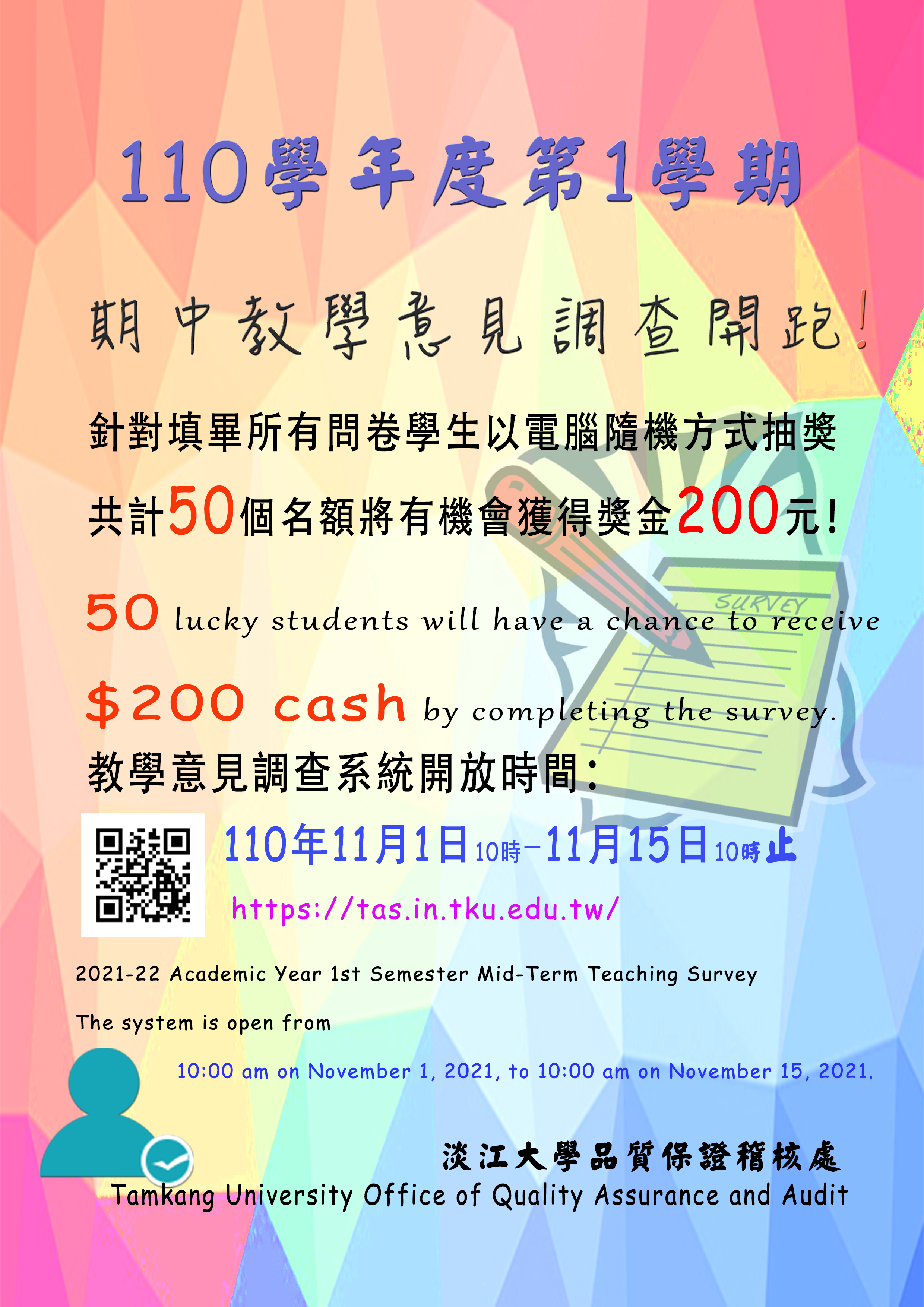 調查時間:110年11月1日上午10時至11月15日上午10時止 獎 金:200元 得獎人數:50位 抽獎資格:於調查期間,只要填寫完所有修課的教學意見調查問卷,並選擇參加抽獎,即獲得抽獎資格。 抽獎方式:系統即時抽獎 領獎方式:至覺生綜合大樓I801室品質保證稽核處(蘭陽及台北校園的獲獎同學請至系辦)領取獎金及填寫領取清冊(境外生需額外檢附護照或居留證影本) 填答網址: https://tas.in.tku.edu.tw/